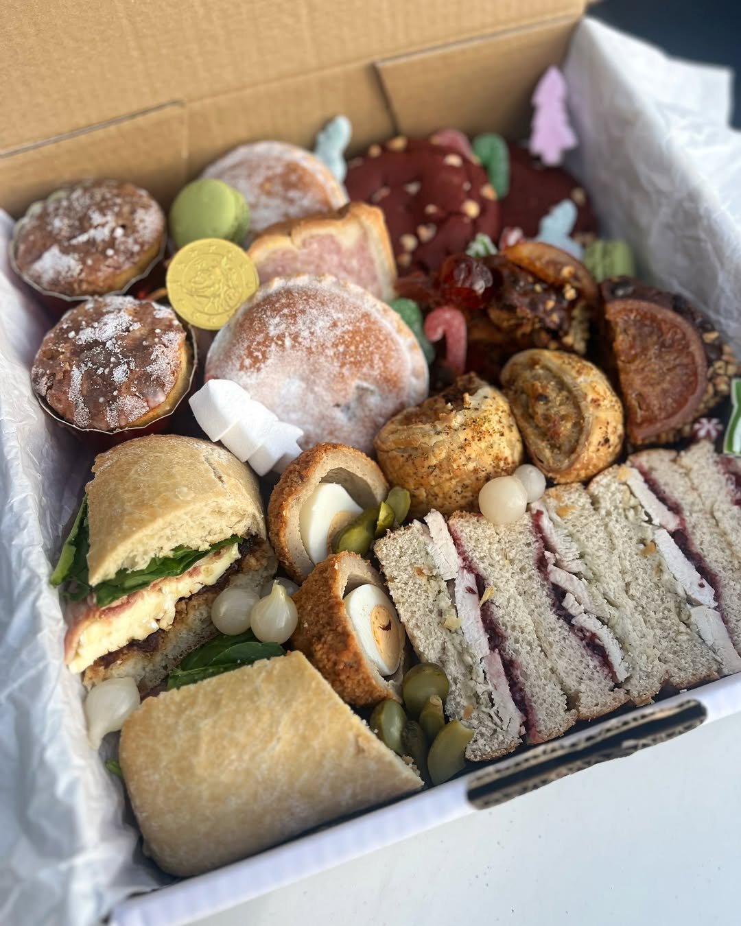 A charming afternoon tea box with sandwiches, scones, pastry swirls, mini doughnuts, brownies, and festive sweets — a delightful sweet and savoury treat.