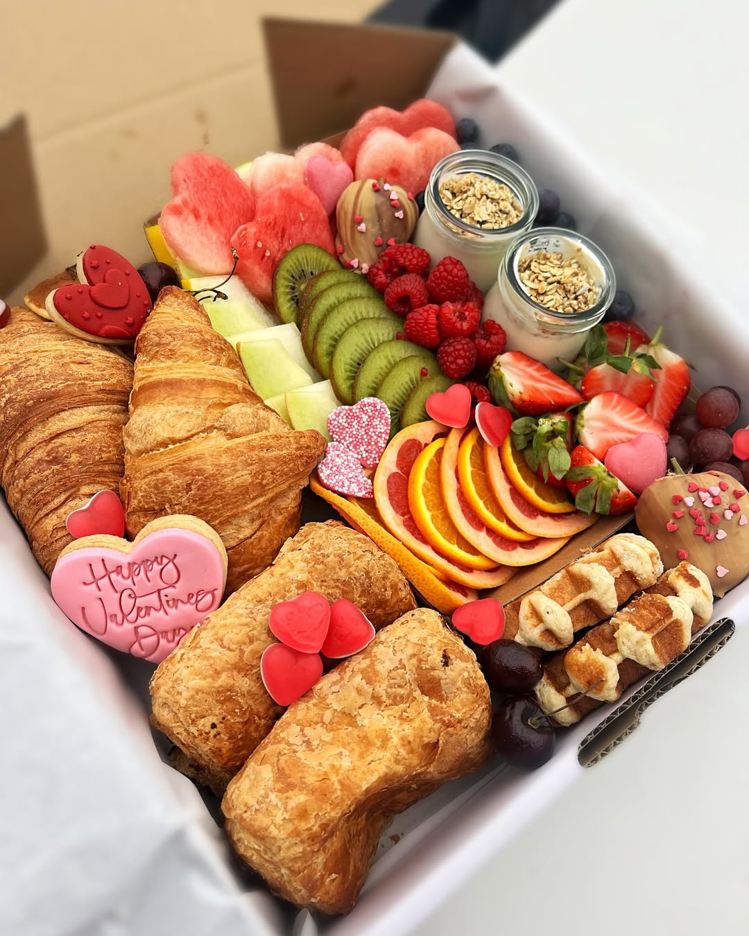 Wake up to love with this gorgeous Valentine’s Day breakfast grazing box, thoughtfully designed to make the morning feel as special as the occasion. Featuring buttery golden croissants, a flaky almond pastry, mini Belgian waffles, heart-shaped watermelon slices, sliced kiwi, melon fingers, fresh raspberries, strawberries, orange and grapefruit slices, juicy cherries and grapes, alongside indulgent granola yoghurt pots and a chocolate-dipped strawberry. Finished with a personalised “Happy Valentine’s Day” iced heart biscuit and adorable heart-shaped sugar decorations throughout. A truly romantic and unforgettable morning treat for your loved one.